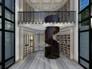 Just beyond, a dramatic two story stair hall rises beneath a skylit atrium, introducing natural light deep into the home. The grand stair connects to the private upper level, which includes the primary suite, three children’s bedrooms, and the upper gallery of a two story library, reinforcing the sense of vertical openness and quiet monumentality throughout the residence.
