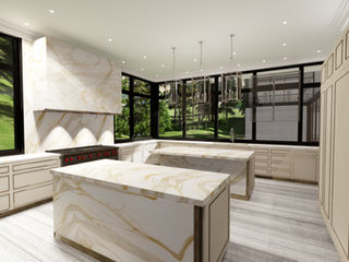 The main house, designed in collaboration with Project Director AK Design Group, draws inspiration from 1940s modern French architecture. Its planning is rooted in classical principles, organized around a strong central axis with the primary living spaces symmetrically arranged to either side. On the ground floor, this axis culminates at a fireplace that anchors the kitchen and family room, creating a natural focal point for daily life and gathering.